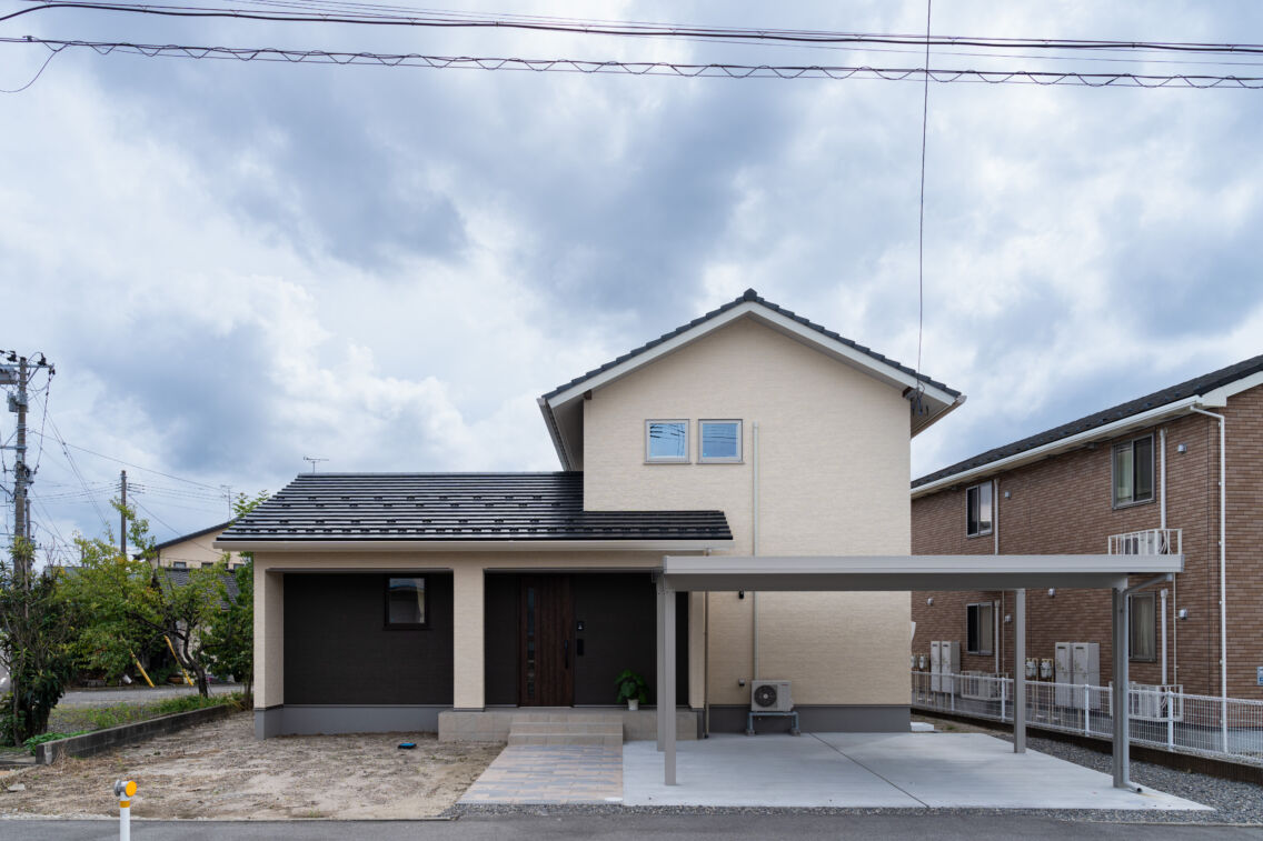 切妻屋根のシンプルなデザイン。優しいアイボリーにブラウンのアクセントを入れ、落ち着いた佇まいにまとまっています。