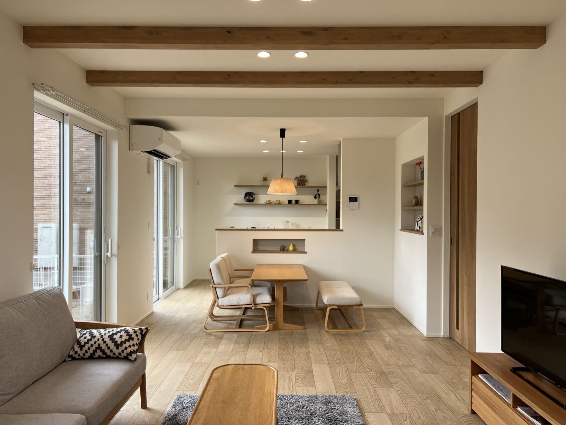 白と明るめの木の色にグレージュのアクセントを取り入れた、可愛いすぎないジャパンディスタイル。飽きのこないシンプルなデザインなので、ディスプレイが引き立ちます。